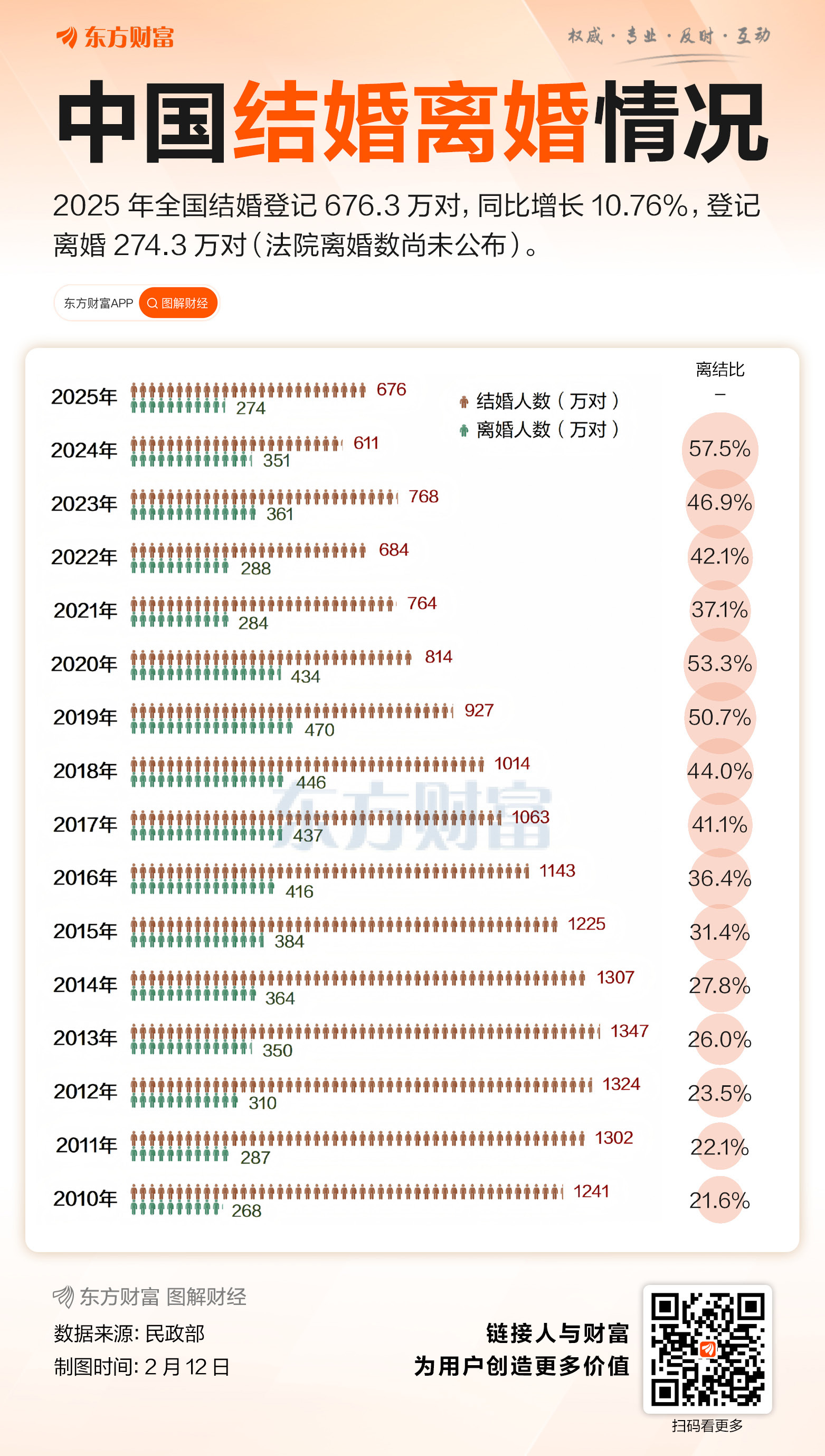 民政部2月11日公布的数据显示,2025年全国结婚登记676.3万对,较上年增加了65.7万对,同比增长10.76%;离婚登记274.3万对(法院离婚数据尚未公布。2024年,全国离婚数量为351.3万对,其中:民政部门登记离婚262.2万对,法院判决、调解离婚89.1万对)。
