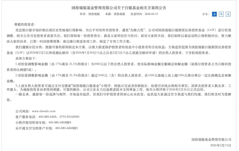 2月15日晚间,国投瑞银基金公告称,将对受国投白银LOF估值调整影响的投资者进行补偿,遵循分层分类、便捷可靠的原则制定本方案,以最大限度保护投资者特别是中小投资者的合法权益。方案适用范围为国投瑞银白银期货证券投资基金(LOF)以2026年2月2日净值确认赎回(含2026年1月30日15点之后至2月2日15点之前提交赎回申请)的自然人投资者,不含机构投资者。具体方案: