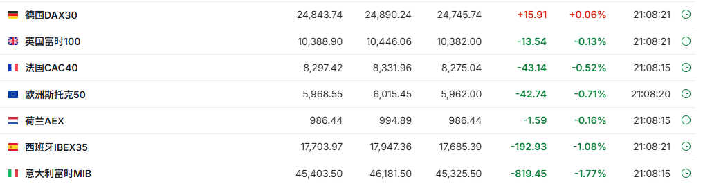 正在交易的欧洲股市多数走低,德国DAX指数现涨0.06%,英国富时100指数跌0.13%,法国CAC40指数跌0.52%。