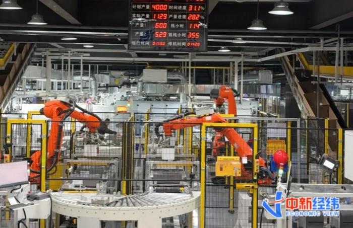 在燃气热水器冲压底壳生产线,中新经纬看到机械臂起落翻转,焊枪火星四溅,8台六轴机器人完成从冲压、焊接、码垛到物流入库的全流程作业。