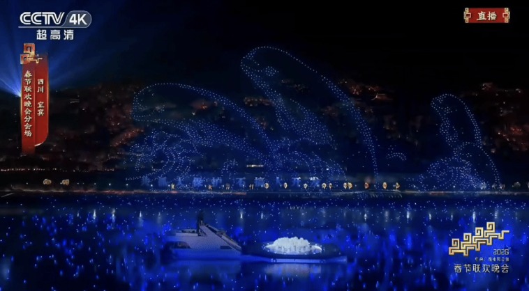 在春晚宜宾分会场,10架“云影”无人机在成飞“文鳐”智慧管控系统操作下,垂直升空后改平飞,之后又调整为楔形编队绕场飞行;2架“翼龙”无人机从自贡起飞。