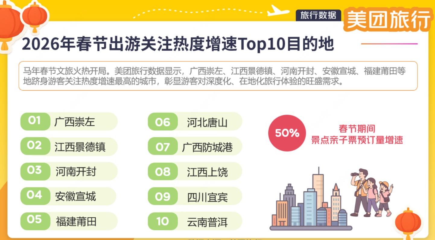 与此同时,一批文化底蕴深厚、体验独特的中小城市快速“出圈”。美团旅行数据显示,广西崇左、江西景德镇、河南开封、安徽宣城、福建莆田、河北唐山、广西防城港、江西上饶、四川宜宾、云南普洱跻身游客关注热度增速最高的城市,彰显游客对深度化、在地化旅行体验的旺盛需求。