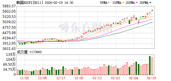 今日(2月19日),在芯片股的带动下,韩国股市大幅走高。其中,韩国KOSPI指数一度涨超3%,再创历史新高。三星电子一度涨超5%,SK海力士涨超2%。