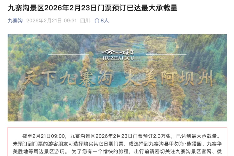 2月21日,九寨沟景区发布的消息显示,截至2月21日09:00,九寨沟景区2026年2月23日门票预订2.3万张,已达到最大承载量。