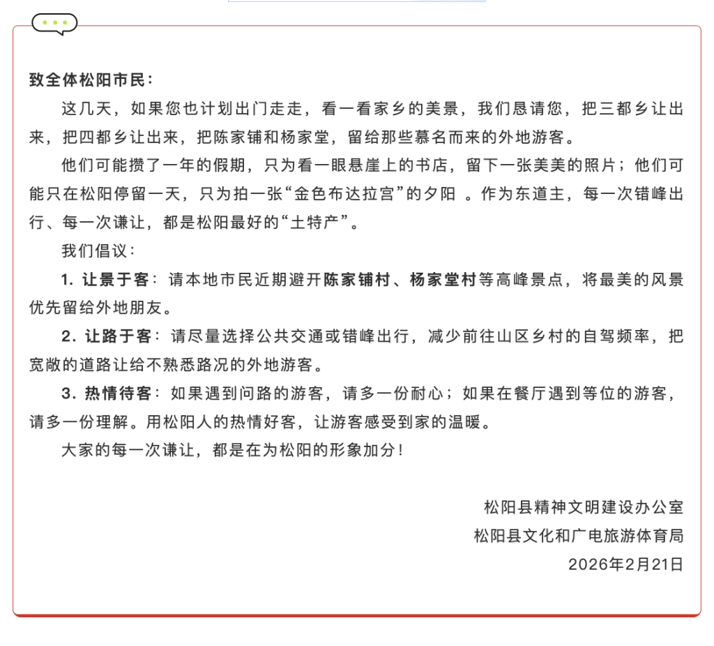 如浙江省丽水市松阳县2月21日发布倡议,建议当地市民“让景于客,让路于客,热情待客”。