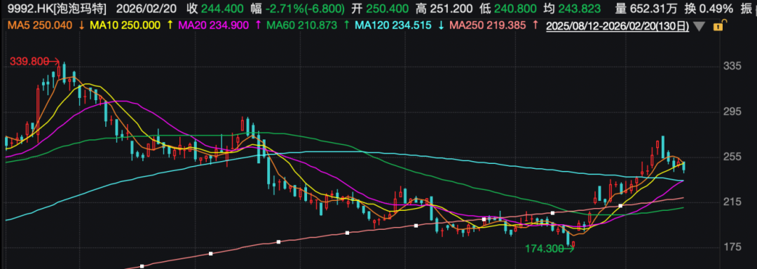 2025年8月底以来,泡泡玛特股价一度经历了深度回调,最高从339.8港元/股跌至174.3港元/股,逼近腰斩。