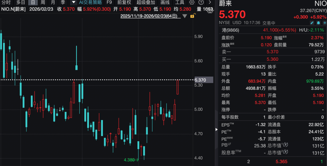 纳斯达克中国金龙指数逆势上涨。蔚来涨近6%。2月23日,蔚来公众号公布,2月22日蔚来换电177627次,马年新春以来,已连续五日刷新历史新高。另外,禾赛科技、虎牙等涨超3%,亚朵、理想汽车、水滴公司、微博、文远知行等涨超2%。