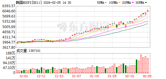 今日(2月25日),韩国股市高开高走,韩国综合股价指数(KOSPI)史上首次突破6000点整数关口,盘中涨幅一度接近3%。截至收盘,KOSPI指数上涨1.91%报6083.86点,创收盘历史新高。三星电子、SK海力士涨幅均超过1%,双双刷新历史新高。