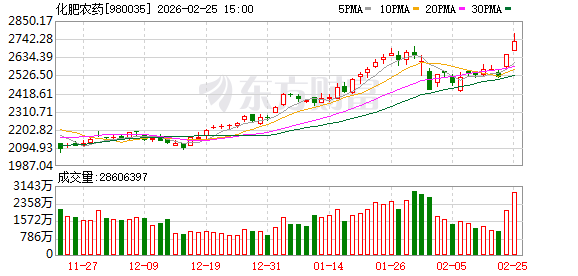 2月25日,化肥农药板块再度拉升。化肥农药指数盘中一度涨超4%。川金诺“20CM”涨停,赤天化、云天化、六国化工、司尔特、金正大等涨停。