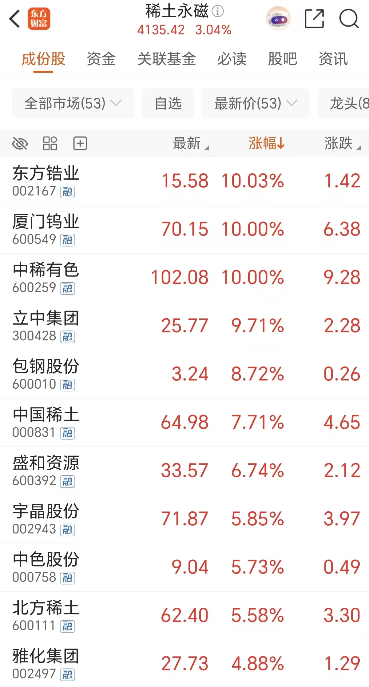 周五领涨的板块无疑是稀土板块,收盘东方锆业、厦门钨业、中稀有色等多股涨停,龙头股中国稀土涨超7%,北方稀土涨超5%。