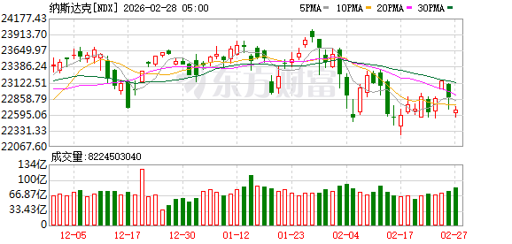 美股市场:美股三大指数02月27日收盘全线下跌。截至收盘,道琼斯工业平均指数比前一交易日下跌521.28点,收于48977.92点,跌幅为1.05%;标准普尔500种股票指数下跌29.98点,收于6878.88点,跌幅为0.43%;纳斯达克综合指数下跌210.17点,收于22668.21点,跌幅为0.92%。