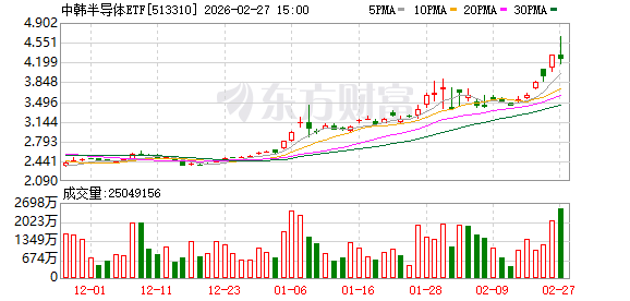 公开资料显示,华泰柏瑞管理的中韩半导体ETF成立于2022年11月2日,基金经理是柳军和李沐阳。根据2025年四季报披露,该基金前十大重仓股分别为三星电子、SK海力士、寒武纪、中芯国际、海光信息、北方华创、兆易创新、澜起科技、中微公司和豪威集团。随着重仓股三星电子和SK海力士等股价在2026年一路狂飙,中韩半导体ETF今年以来也大涨67.68%,并在2月26日盘中创下了历史新高4.33元。