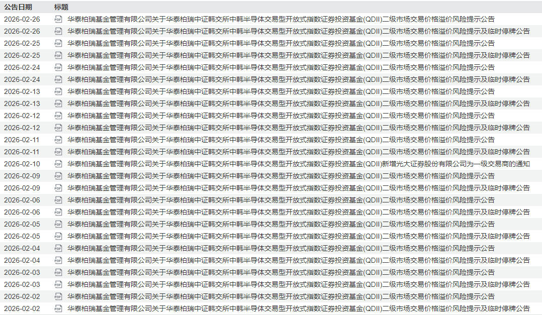 2月26日,华泰柏瑞基金在公告中再次重申,中韩半导体ETF二级市场交易价格明显高于基金份额参考净值,出现较大幅度溢价。特此提示投资者关注二级市场交易价格溢价风险,投资者如果盲目投资,可能遭受重大损失。同时表示,若本基金后续二级市场交易价格溢价幅度未有效回落,有权采取向上海证券交易所申请盘中临时停牌、延长停牌时间等措施以向市场警示风险,投资者如果盲目投资于高溢价率的基金份额,可能面临重大损失。