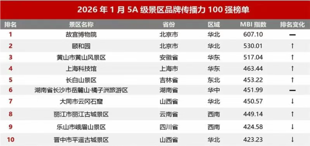 近日,迈点研究院公布“2026年1月5A级景区品牌传播力100强榜单”,故宫博物院、颐和园、黄山市黄山风景区、上海科技馆、长白山景区、湖南省长沙市岳麓山·橘子洲旅游区、大同市云冈石窟、丽江市丽江古城景区、乐山市峨眉山景区、晋中市平遥古城景区位列榜单前十。