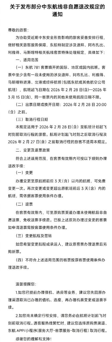 2月28日,东航发布通知称,为协助受近期中东安全形势影响的旅客妥善安排行程,做好相关旅客服务保障,东航特制定涉及迪拜、阿布扎比、利雅得、马斯喀特相关航线客票特殊处理规定。