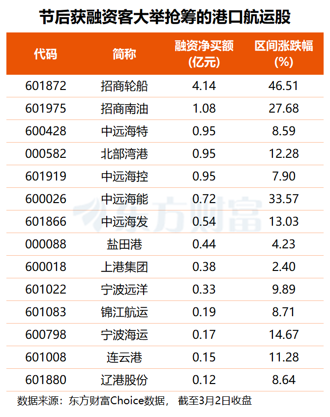 资金方面,东方财富Choice数据显示,节后(2月24日)以来,共有19只港口航运股获得融资净买入,其中,招商轮船、招商南油分别获融资客大举抢筹4.14亿和1.08亿元,中远海特、北部湾港、中远海控均获杠杆资金加仓约0.95亿元,中远海能、中远海发的融资净买额也都在5000万元以上。