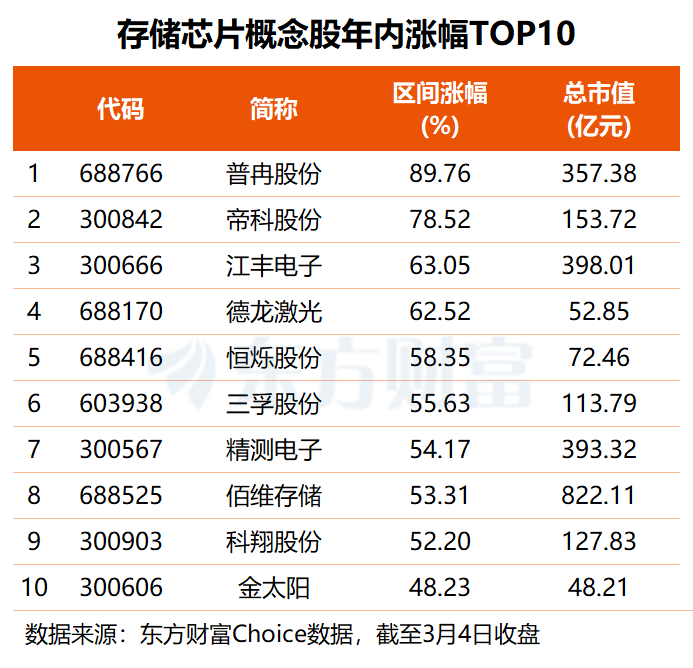 年初至今,约七成存储芯片概念股录得股价上涨,平均涨幅约14%,其中,普冉股份股价大涨九成,帝科股份以78.52%涨幅位居次席,江丰电子、德龙激光涨逾62%,恒烁股份、佰维存储、科翔股份等5股均涨超50%。