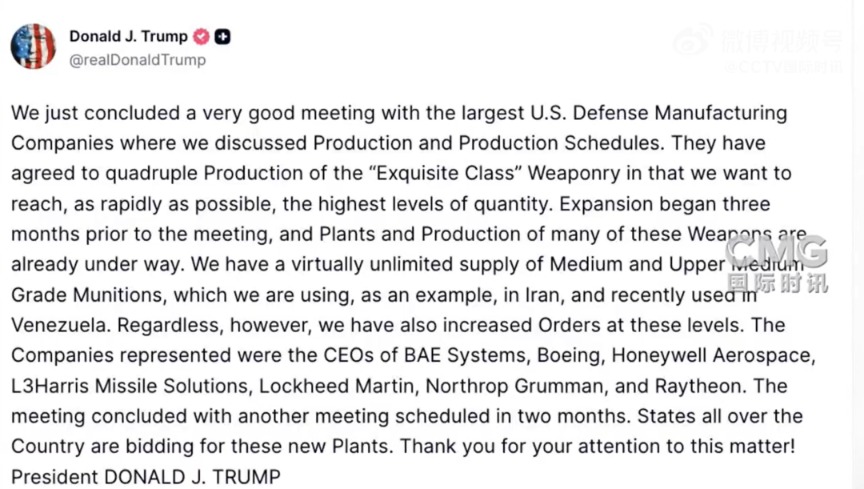 据央视此前报道,特朗普曾表示,美国弹药库存几乎无穷无尽,急召军工巨头赴白宫开会。