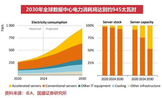 近期,AI算力带来的电力需求,成了资本市场的重要叙事之一。根据IEA数据,2024年全球数据中心用电量约为415TWh,预计到2030年数据中心用电量上升至945TWh,年均增幅约15%。