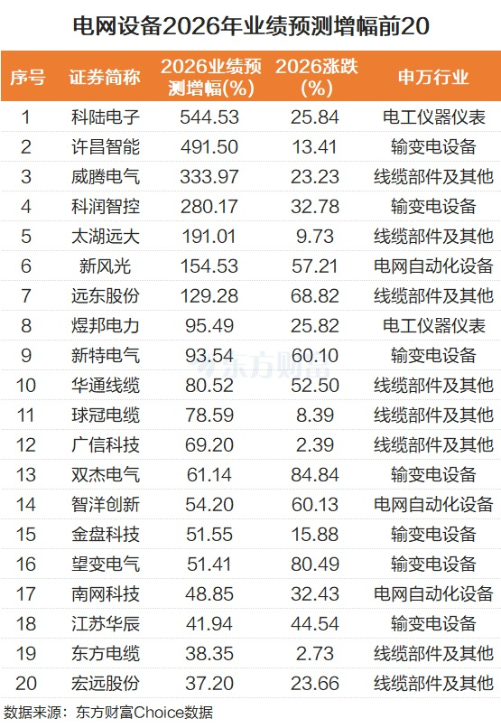 个股角度来看,电网设备板块不少个股,机构预测2026年业绩高增长。科陆电子暂居首位,2026年业绩同比增幅544.53%。许昌智能、威腾电气、科润智控、太湖远大、新风光、远东股份2026年业绩也预计同比翻倍。