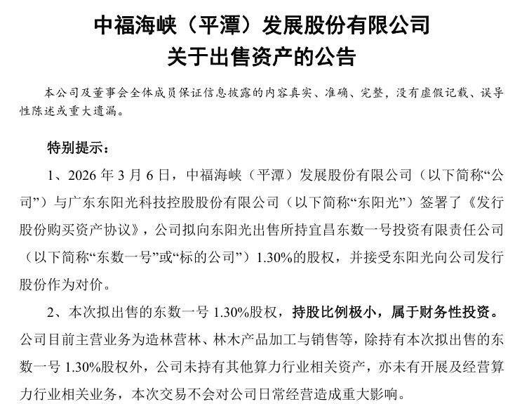 3月7日,平潭发展(000592)发布公告,公司与广东东阳光科技控股股份有限公司(600673)签署了《发行股份购买资产协议》,拟向东阳光出售所持宜昌东数一号投资有限责任公司1.30%的股权,并接受东阳光向公司发行股份作为对价。