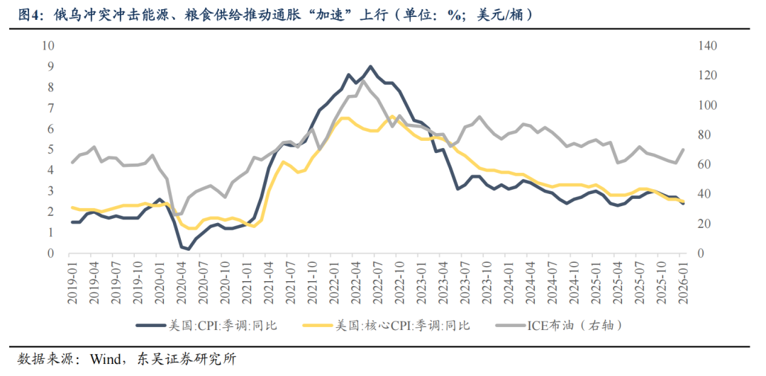 流动性层面,2022年与2026年同处于流动性大级别切换的过渡期。2022年是美联储加息周期的起点,流动性由极度宽松转向快速收紧,核心是疫情后美国大规模财政补贴带来的过剩流动性,叠加俄乌冲突冲击能源、粮食供给推动通胀“加速”上行。2026年处于宽松周期的尾声阶段,绝对利率水平仍维持高位。高企的财政赤字对通胀形成持续上行压力,而地缘政治因素将进一步扰动通胀预期,或直接导致降息进程按下“暂停键”。