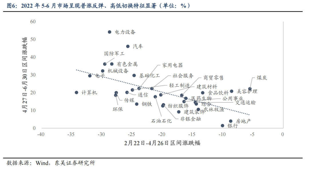 5-6月,疫情拐点+稳增长信号,市场反弹。随着前期部分地区疫情进入收尾阶段,社会面新增确诊人数清零,全面复商复市逐步开启。同时,4月底政治局会议召开,释放较强稳增长信号,各部委持续跟进,政策端频繁释放稳住经济大盘的决心。内外部困局缓解,多个利空因素落地,市场风险偏好明显改善。这一阶段市场呈现普涨反弹、高低切换特征显著——前期超跌的板块反弹力度最大。同时能源价格升高背景强化了新能源替代逻辑,4月27日至6月末一级行业中电力设备板块领涨,二级行业能源金属、金属新材料、光伏、风电均涨超60%。