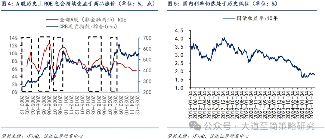 (3)商品涨价和利率下行的组合反而有利于牛市。原油价格上涨引发的全球宽松预期摇摆和滞胀的担心。我们认为对于原油价格的中期判断仍需基于地缘冲突发酵的程度和霍尔木兹海峡的运输情况。但从历史情况来看,滞胀是比较罕见的经济现象,只有极为特殊的时期,才会出现商品涨、股市跌的情况。从美股的经验来看,商品价格上涨的时候,大部分时候对应的是牛市,只有极少数时间(1968-1969、1973-1974、1987)才会出同时出现商品涨、股市跌。因为商品涨价虽然结构上会影响到下游的利润,但大部分情况下会驱动股市整体ROE的抬升。少数几次例外大多出现在利率快速上行期,特别是1973-1974年的熊市中。此时利率上行的负面影响远超过ROE上行的正面影响。