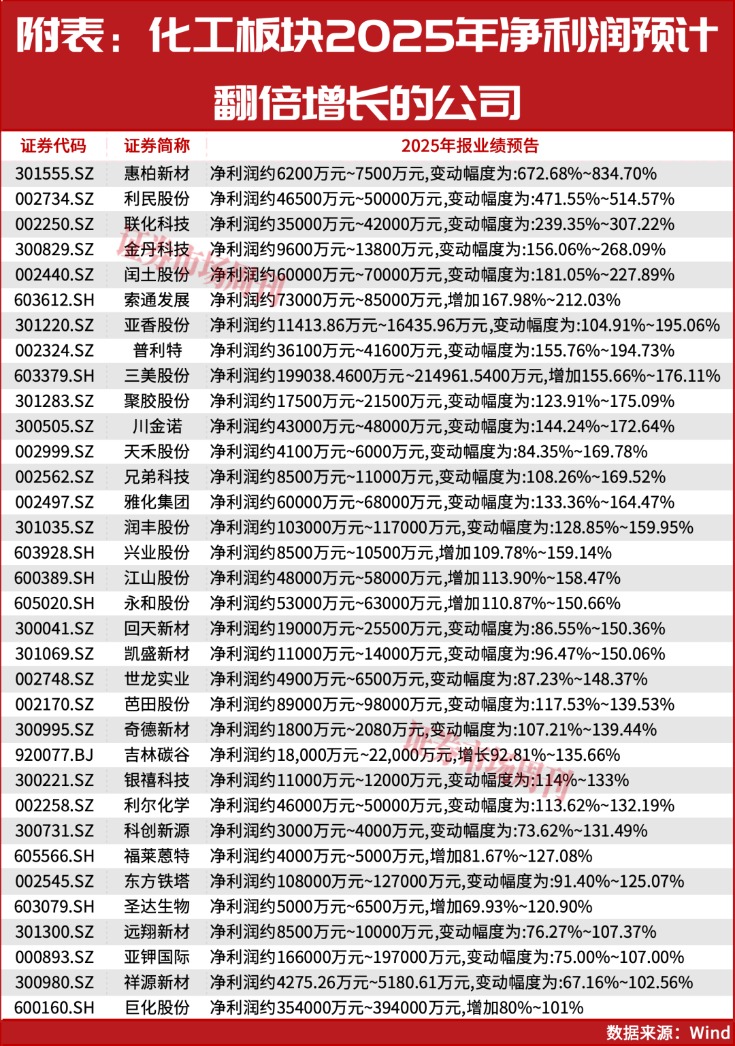化工板块中,惠柏新材的预增幅度最为喜人(见附表),2025年,风电叶片用环氧树脂产品销售实现大幅增长,带动利润同步增长。其中,受益于风电行业景气度上升,风电叶片用环氧树脂产品需求旺盛,同时,公司积极拓展海外市场,发展海外客户,风电叶片用环氧树脂销量较2024年实现明显增长,公司新型复合材料用环氧树脂产品和电子电气绝缘封装用环氧树脂产品的收入也相比去年同期有所提升,从而推动公司归母净利润同比大幅预增672.68%-834.7%。