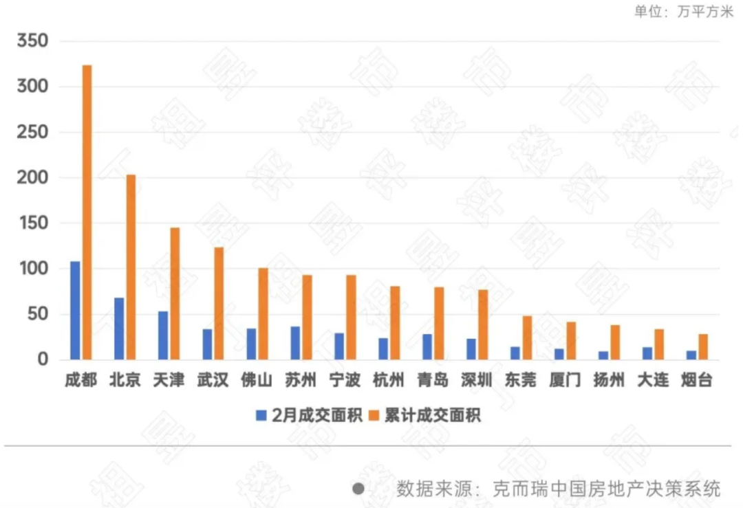 二手房方面,成都2月单月成交面积就已达108.2万平方米;累计来看,前2月成交面积323.6万平方米,不仅规模明显高于其他城市,累计同比还有18%涨幅。