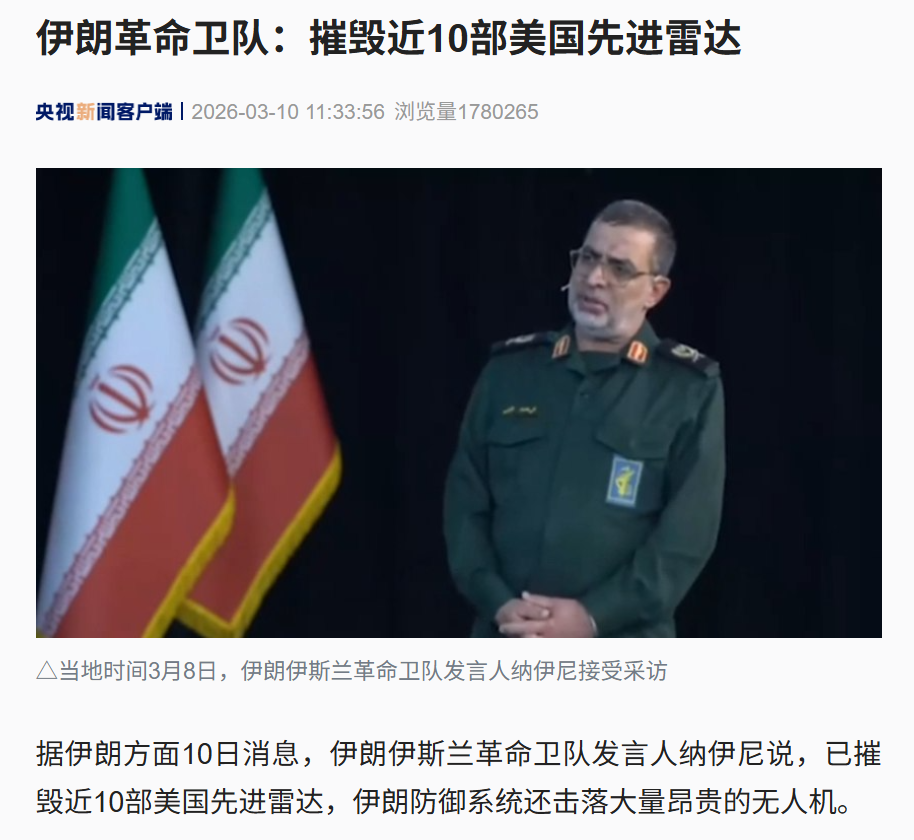 据伊朗方面10日消息,伊朗伊斯兰革命卫队发言人纳伊尼说,已摧毁近10部美国先进雷达,伊朗防御系统还击落大量昂贵的无人机。