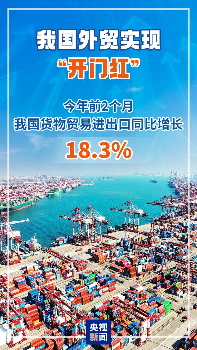海关总署今天对外公布外贸数据,今年前2个月,各地区各部门主动作为、靠前发力,广大外贸企业积极稳订单、拓市场,我国货物贸易进出口同比增长18.3%,外贸开局良好。