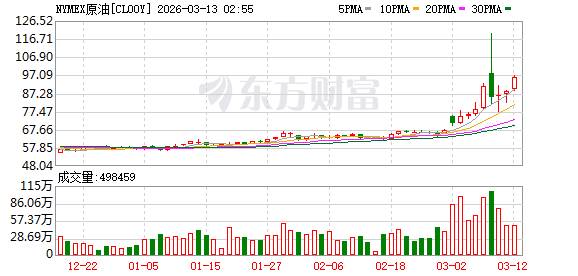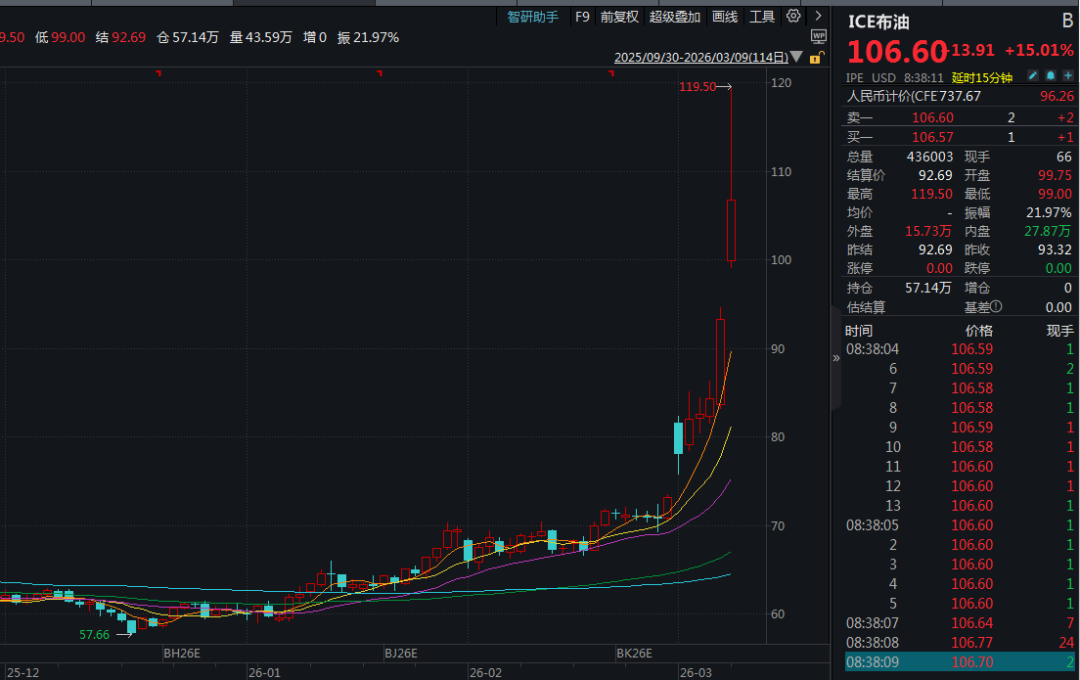 截至发稿前,其近月2605合约报于108美元/桶附近,涨幅从早盘的30%回落至17%。