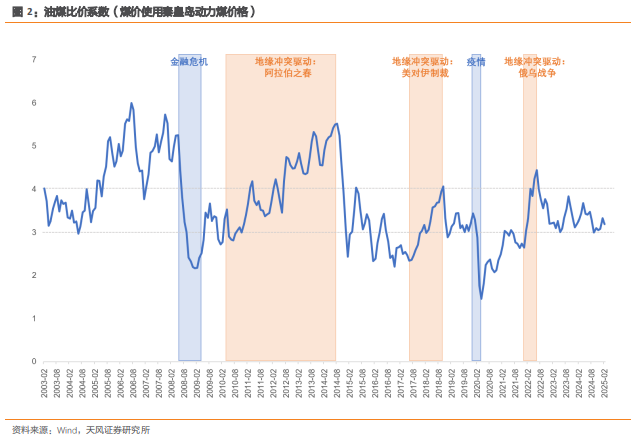 相关数据显示,按热值等价计算,油煤长期存在稳定比价中枢,长期油、煤热值比价中枢为3.0–3.4。
