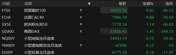 周三盘前,美股三大股指期货齐跌,欧洲主要指数普遍下跌。截至发稿,纳斯达克100指数期货跌0.16%,道指期货跌0.12%,标普500指数期货跌0.18%。