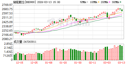储能概念大爆发主要与近期消息面的持续催化有关。一方面,“算电协同”首次被写入政府工作报告,成为新型基础设施建设的重要部署,储能有望受益;另一方面,2026年政府工作报告明确提出“着力构建新型电力系统,加快智能电网建设,发展新型储能,扩大绿电应用”。这是继2025年后,新型储能再次被写入政府工作报告。