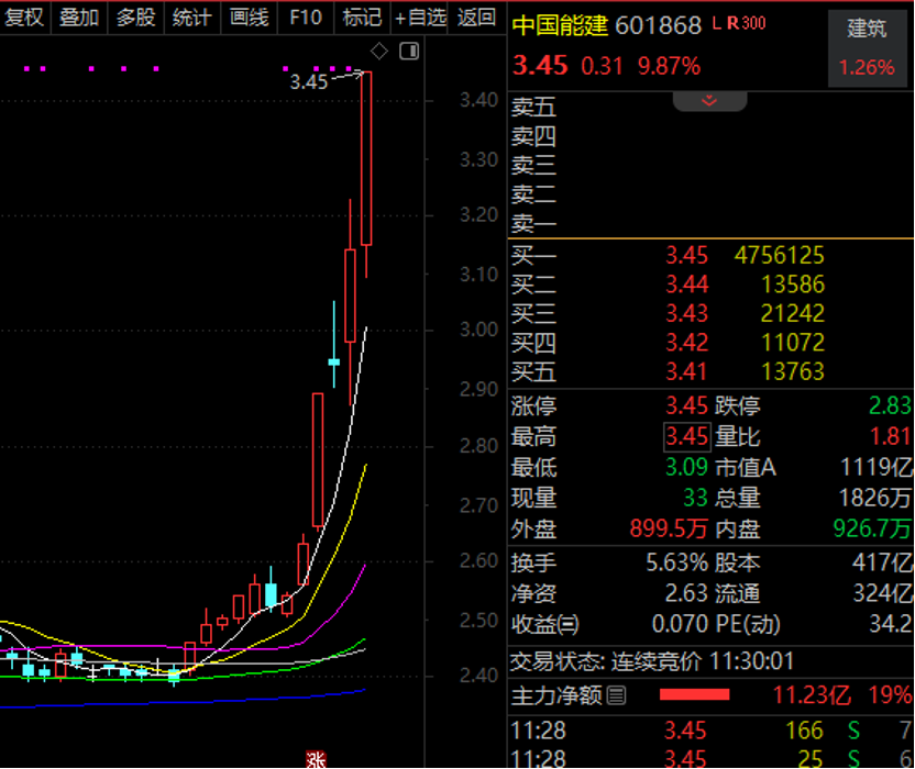 其中,中国能建(601868)再度涨停,为近期的第二个涨停板。截至上午收盘,该股封单超过475万手。