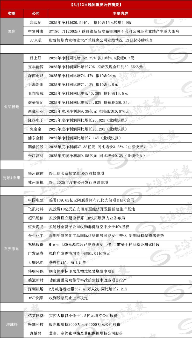 受益于人工智能等产业趋势的强劲拉动,3月12日晚间,又有一批A股上市公司集中报喜,业绩增长与高分红成为重点。
