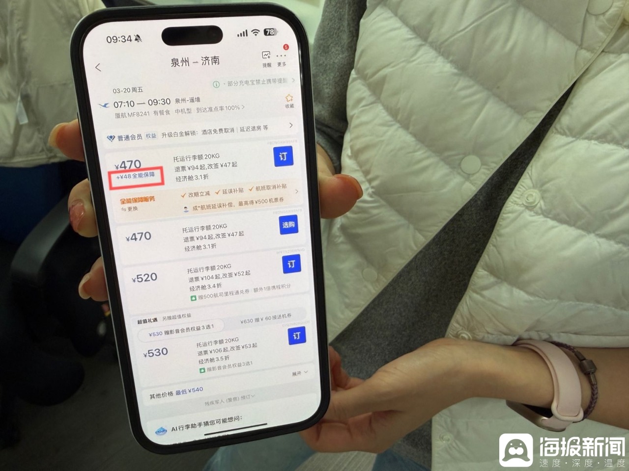 3月11日,海报新闻记者同姜女士再次模拟购票过程发现,在搜索完该航班后,携程平台展现出了多个购票方式,第一种为470元,有一行远远小于470元报价的小字“+48全能保障”,该购票方式下方有保障的服务内容。