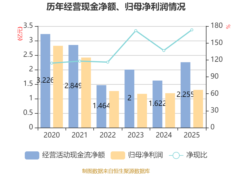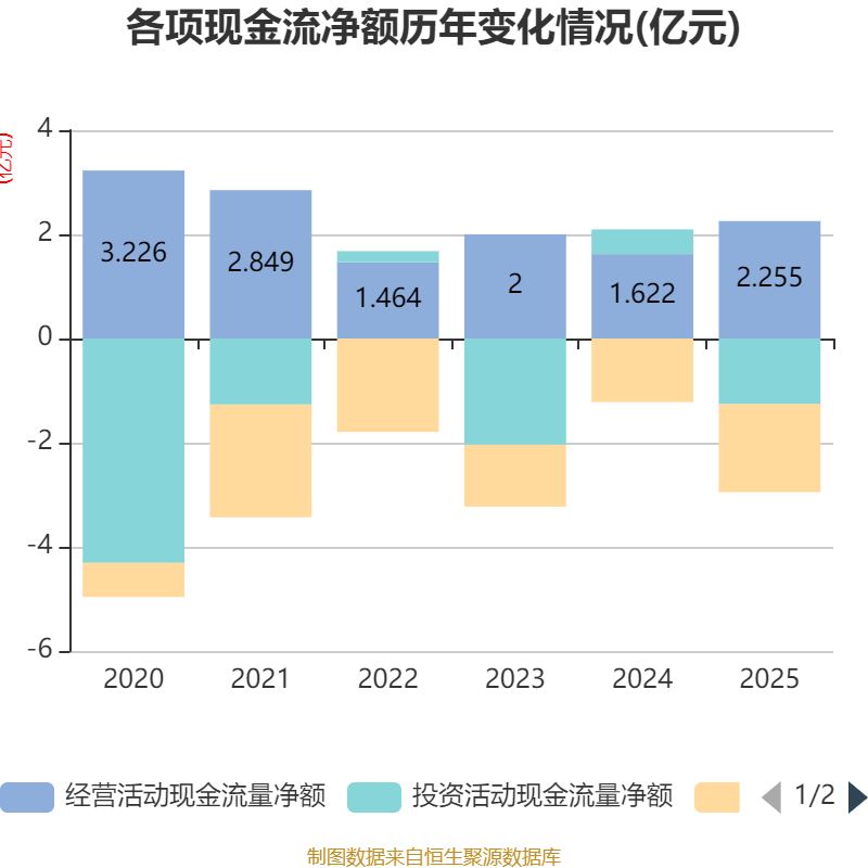截至2025年,公司经营活动现金流净额为2.25亿元,同比增长39%;筹资活动现金流净额-1.69亿元,同比减少4703.9万元;投资活动现金流净额-1.26亿元,上年同期为4737.77万元。