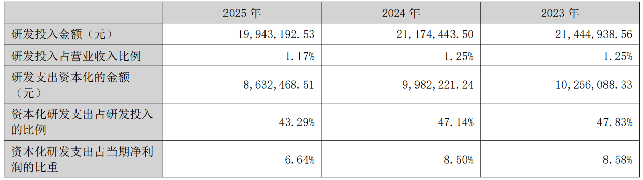 2025年全年,公司研发投入金额为1994.32万元,同比下降5.81%;研发投入占营业收入比例为1.17%,相比上年同期下降0.08个百分点。此外,公司全年研发投入资本化率为43.29%。