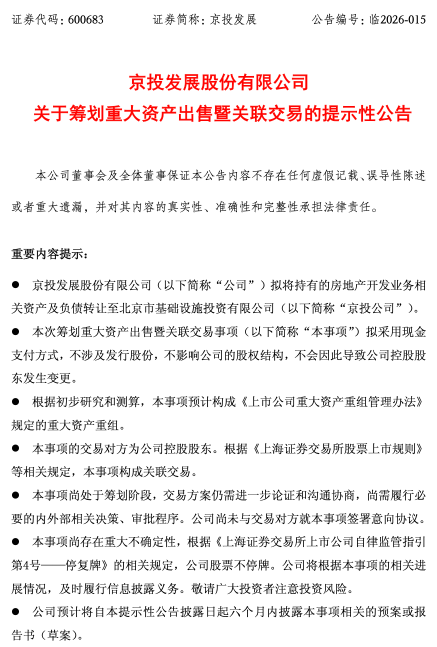 关于该事项对上市公司的影响,京投发展称,公司目前的主营业务为房地产开发。通过本事项,公司将持有的房地产开发业务相关资产及负债转让至公司控股股东京投公司。本事项完成之后,公司将不再从事房地产开发业务。