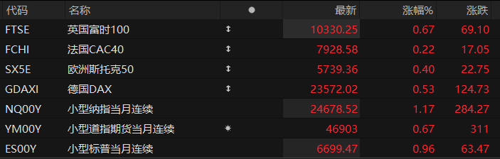周一盘前,美股三大股指期货齐涨,欧洲主要指数普遍上涨。截至发稿,纳斯达克100指数期货涨1.17%,道指期货涨0.67%,标普500指数期货涨0.96%。