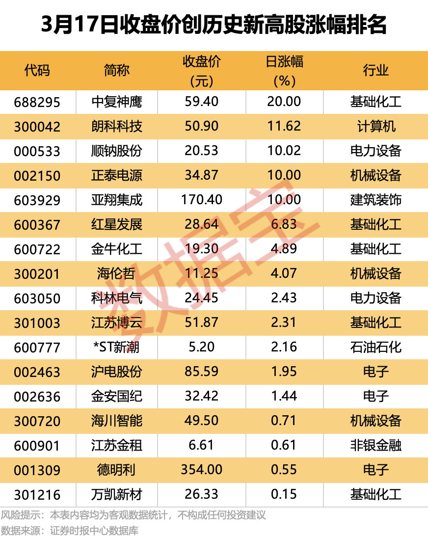 17股收盘价创历史新高
