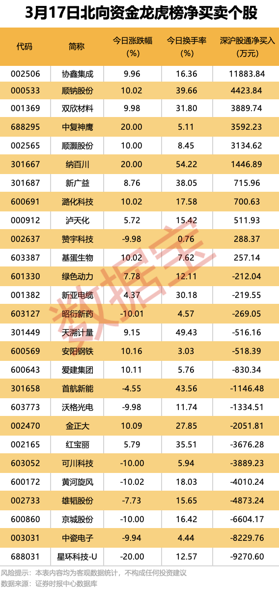 今日龙虎榜现身个股中,11股获北向资金净买入。协鑫集成获净买入居首,金额达1.19亿元;顺钠股份、双欣材料、中复神鹰获北向资金净买入均超3500万元。