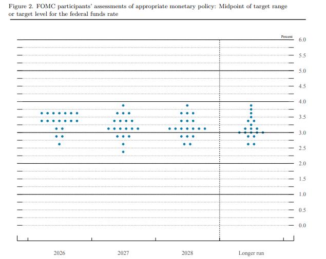 更新版点阵图显示,美联储内部分歧依然巨大。19位与会者中,预计今年降息1次或按兵不动的各有7位,外界预测,有1位主张2026年激进降息100个基点的委员可能依然是米兰。2027年和2028年热门区间为3.00%-3.25%,分别有6位委员和7位委员赞成,但整体分别依然分散,与去年12月类似。