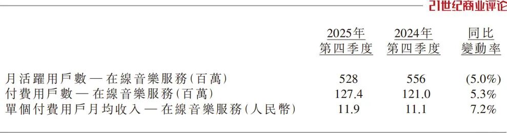 两板斧下,在线音乐服务,包含订阅和非订阅两部分,2025年获得267亿元收入,同比增长22.9%。