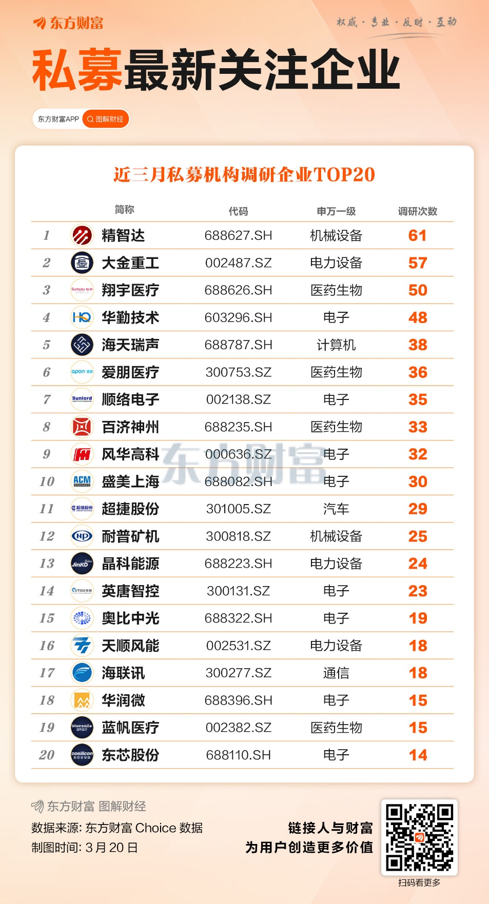 私募机构的调研动向,往往是市场结构性机会的“风向标”。东方财富Choice数据显示,截至3月20日,过去三个月,多家企业吸引私募机构密集调研。从调研次数来看,精智达以61次调研位居榜首,大金重工、翔宇医疗分别以57次、50次紧随其后,华勤技术、海天瑞声等企业也进入前五,彰显出私募机构对高端制造、半导体、AI算力及医疗创新方向的高度认可。