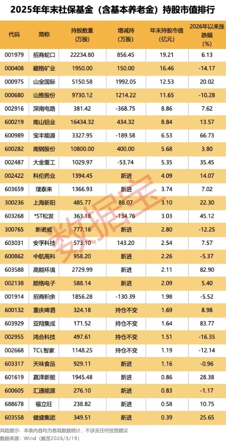 根据持股量统计,招商蛇口、南山铝业、南钢股份的社保基金持股量超过1亿股,分别为2.22亿股、1.64亿股和1.08亿股;年末持股市值超10亿元的个股有4只,分别为招商蛇口、藏格矿业、山金国际、山推股份。
