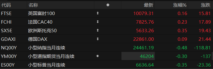 周五盘前,美股三大股指期货齐跌,欧洲主要指数普遍上涨。截至发稿,纳斯达克100指数期货跌0.48%,道指期货跌0.30%,标普500指数期货跌0.35%。